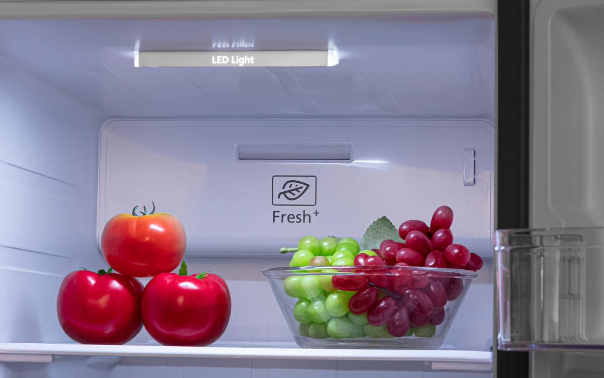 Вместительные контейнеры позволяют хранить достаточное количество овощей и фруктов. Для более длительного хранения и поддержания свежести овощей и фруктов разработаны специальные системы хранения. Среди них, например, зона свежести с увеличенной влажностью до 85% и температурой около 0 градусов. Это герметично закрывающийся ящик, часто на выдвижных роликах или направляющих, в котором имеется специальное задвижка, позволяющая регулировать влажность. Как известно, при более высокой влажности продукты с большим содержанием воды дольше остаются свежими.