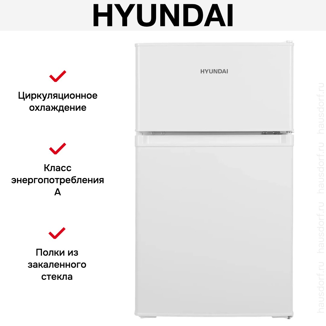 Холодильник с морозильником Hyundai CT10021H белого цвета выглядит лаконично и компактно: корпус 85×48×50 см не займет лишнего места. Две отдельные двери с правым упором и утопленной ручкой образуют ровный фасад, а верхнее расположение морозильного отделения делает доступ к заготовкам быстрым. Отдельностоящее исполнение упрощает выбор места установки.