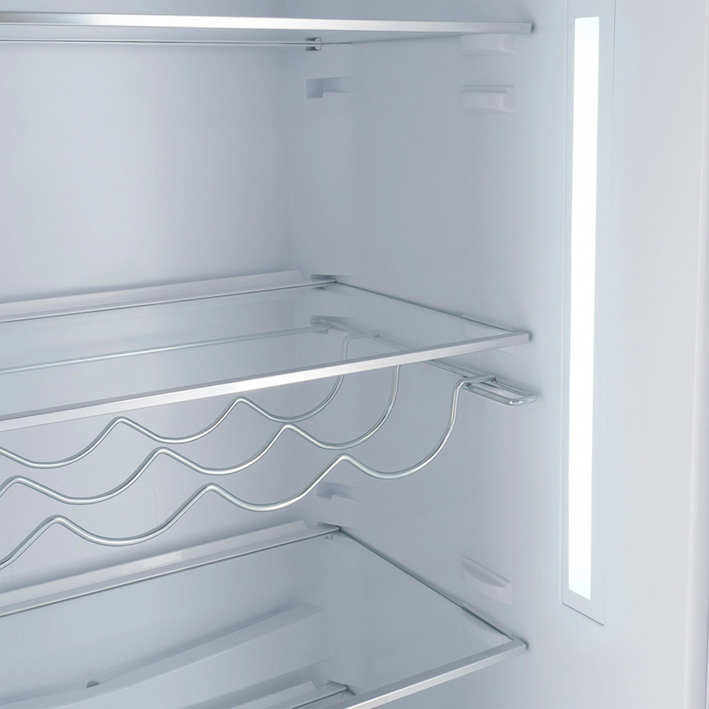 Для стеклянных бутылок, особенно винных и содержащих другие алкогольные напитки, предусматривается размещение на подвесной решетчатой металлической полке. Бутылки на ней располагаются в горизонтальном положении — это оптимальный способ хранения вин. Съемная металлическая полка легко моется под краном.