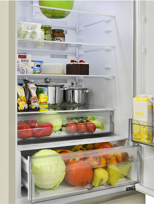 Вместительные контейнеры позволяют хранить достаточное количество овощей и фруктов. Для более длительного хранения и поддержания свежести овощей и фруктов разработаны специальные системы хранения. Среди них, например, зона свежести с увеличенной влажностью до 85% и температурой около 0 градусов. Это герметично закрывающийся ящик, часто на выдвижных роликах или направляющих, в котором имеется специальное задвижка, позволяющая регулировать влажность. Как известно, при более высокой влажности продукты с большим содержанием воды дольше остаются свежими.