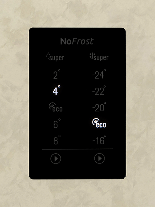 В холодильниках с электронным типом управления основным элементом регулировки температуры служат обычные или сенсорные кнопки. С их помощью можно установить температуру охлаждения или заморозки с точностью до одного градуса. Кроме того, кнопки предназначаются для включения режимов суперохлаждения и суперзамораживания, включения и выключения всего устройства. Все фактические характеристики работы прибора отображаются на дисплее.