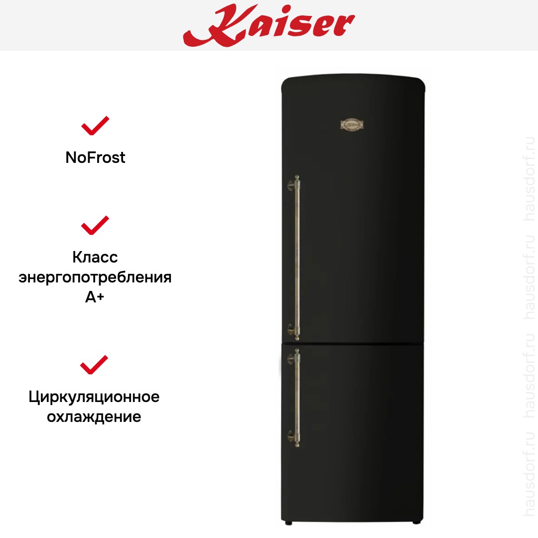 Холодильник Kaiser KK-60825 EM — отдельностоящий холодильник с морозильной камерой снизу, выполненный в строгом черном цвете с бронзовой фурнитурой и фронтом в едином стиле Empire. Его строгое, но благородное оформление впишется в современную и классическую кухню, а вертикальные накладные ручки обеспечивают удобный захват и добавляют образу солидности. При габаритах 199×72.5×60 см прибор занимает умеренное пространство и одновременно предлагает значительный внутренний объем, что делает его хорошим выбором для семейного использования.