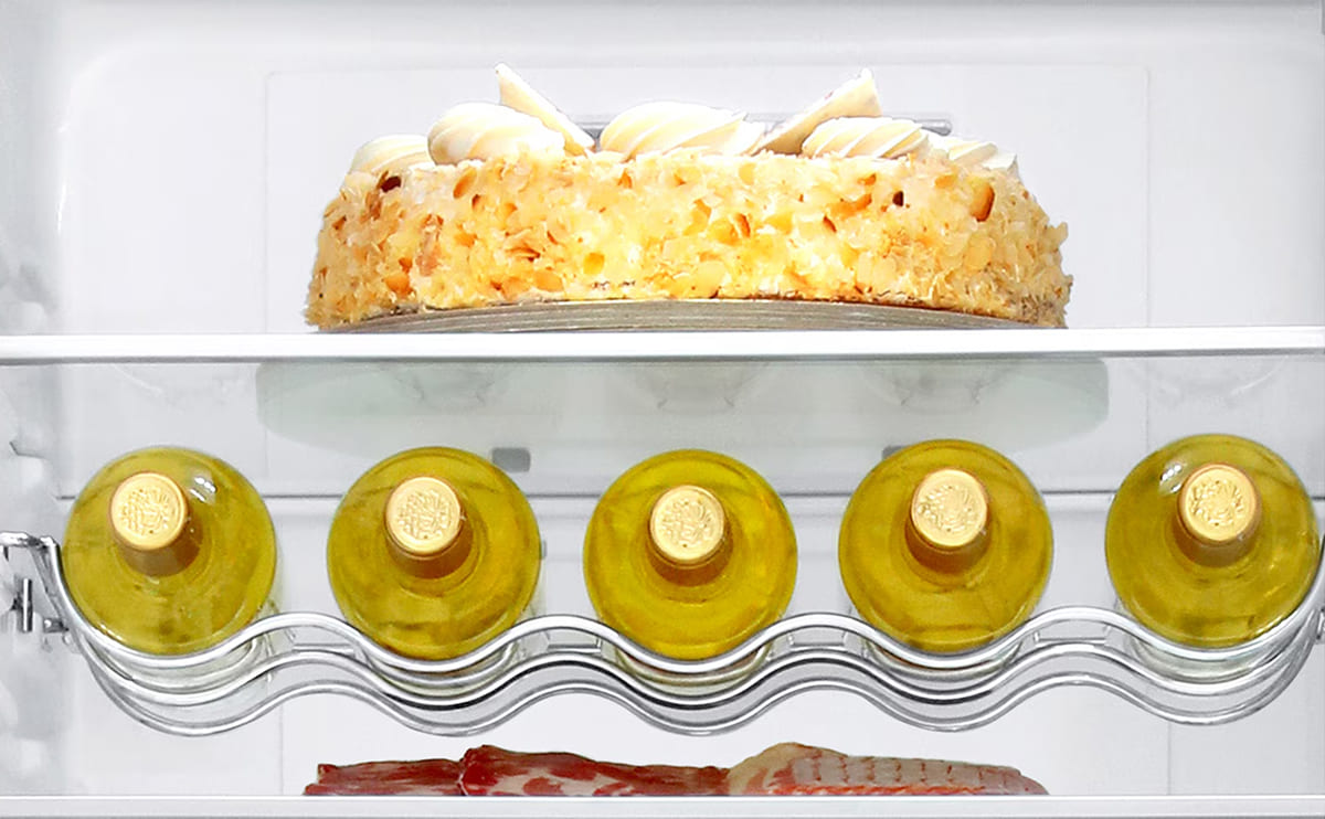 Для стеклянных бутылок, особенно винных и содержащих другие алкогольные напитки, предусматривается размещение на подвесной решетчатой металлической полке. Бутылки на ней располагаются в горизонтальном положении — это оптимальный способ хранения вин. Съемная металлическая полка легко моется под краном.