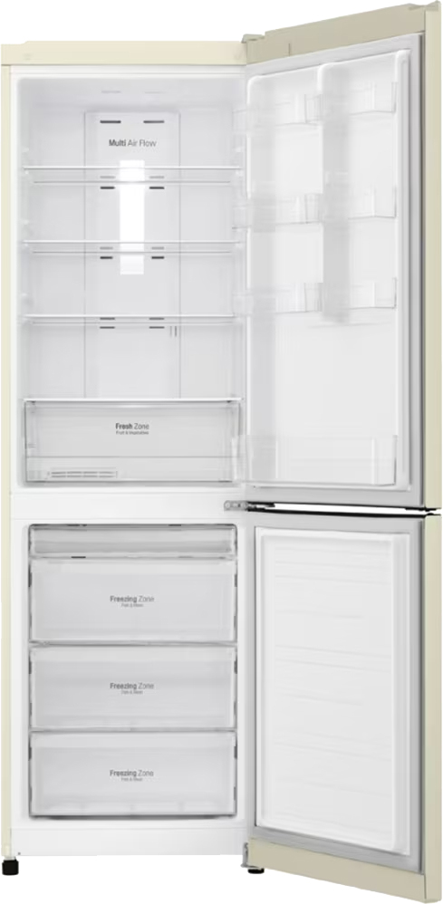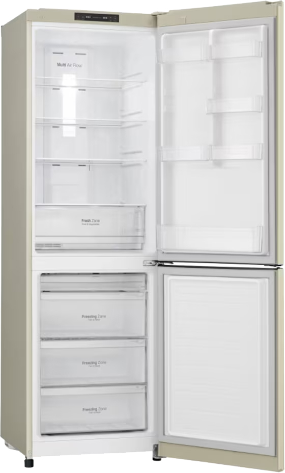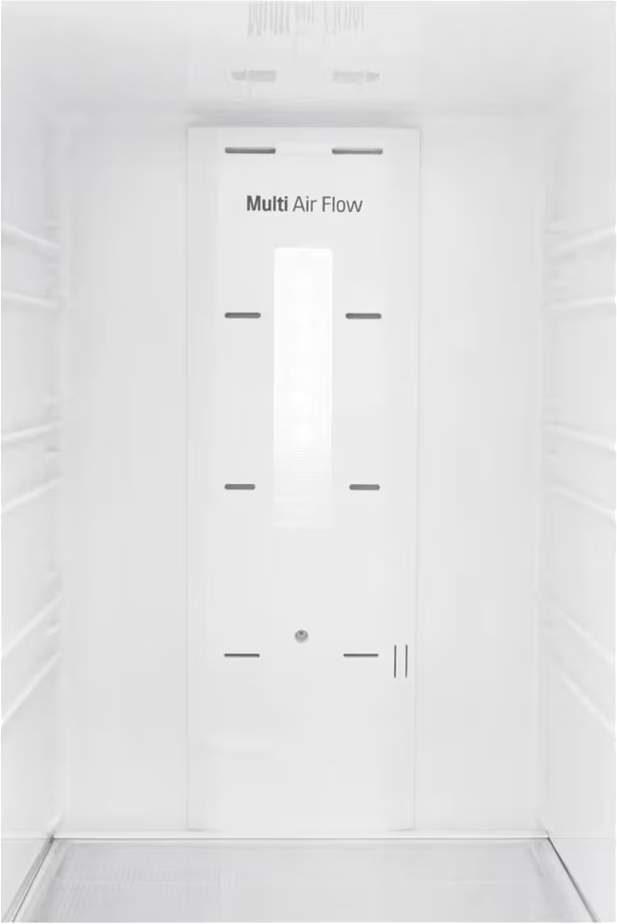 Технологии охлаждения ориентированы на экономию и надёжность. No Frost в обеих камерах исключает образование наледи и избавляет от необходимости ручной разморозки. Система Multi-Airflow System распределяет холод по всем полкам, поэтому температура в каждой зоне остаётся стабильной. Инверторный компрессор с одним контуром обеспечивает тихую работу на уровне 39 дБ и экономичный расход энергии класса A+. Хладагент R600a эффективен и более экологичен по сравнению с традиционными газами.