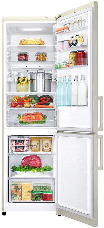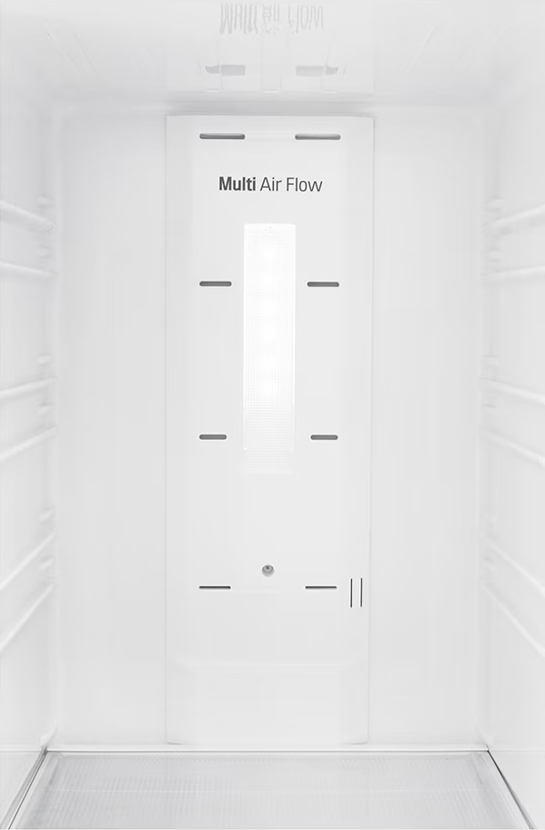 Специальная зона свежести предназначена для правильного и более длительного хранения овощей, фруктов, зелени. В ней поддерживается околонулевая температура, поэтому продукты не перемораживаются и не пересыхают. Система охлаждения этого холодильника — Multi-Airflow-System.