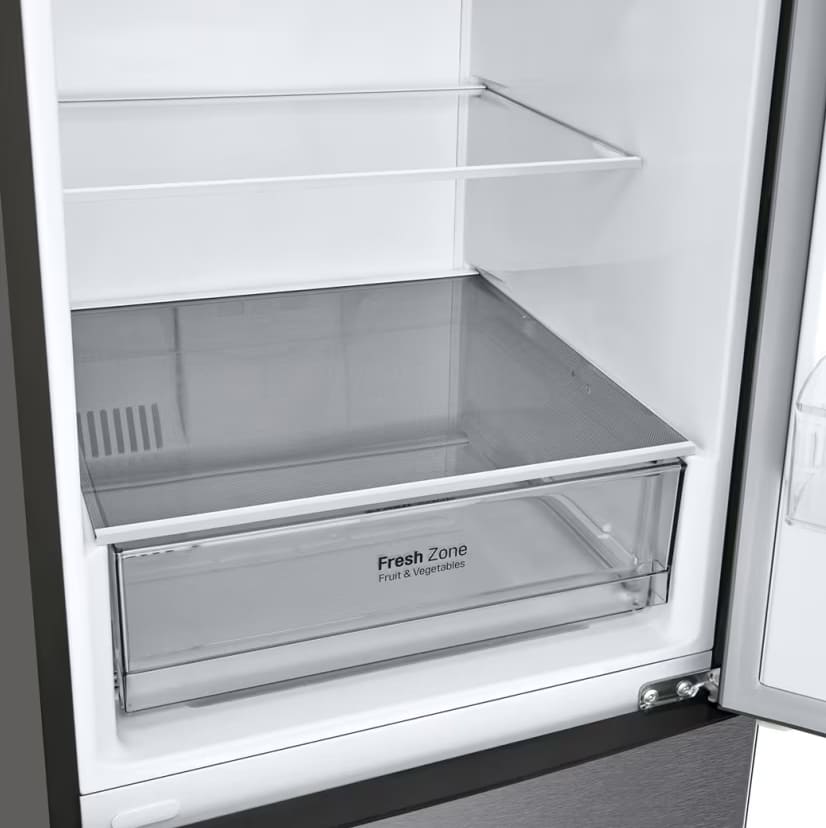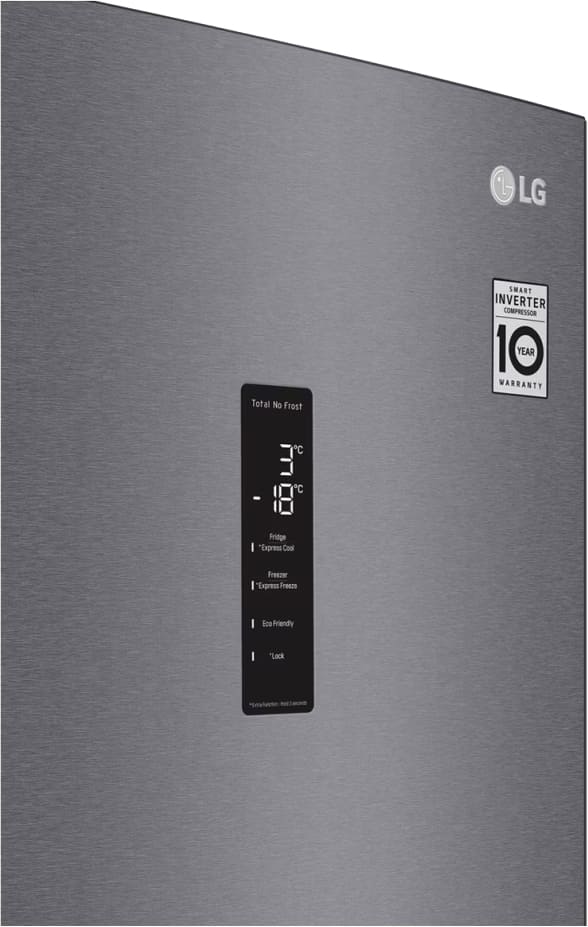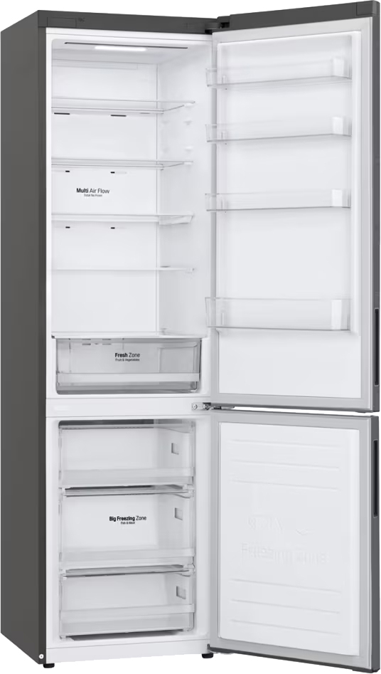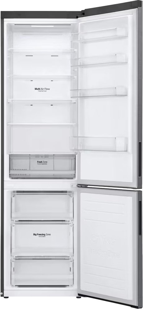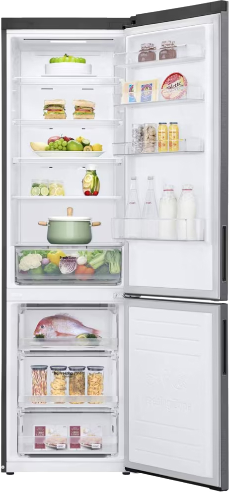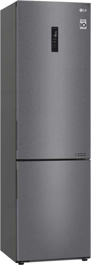 Холодильник LG GA-B509CLSL — стильный отдельно стоящий агрегат, выполненный в графитовом цвете с металлическим фронтом. Визуально он выглядит лаконично и современно, скрытая ручка делает фронт гладким, а тонкий LED-дисплей на дверце добавляет технологичности. Высота 203 см и ширина 59,5 см обеспечивают внушительную вместимость, при этом прибор не выглядит громоздким в стандартной кухне.