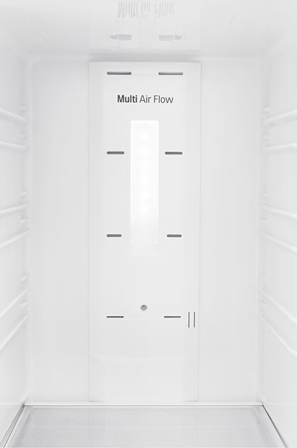 Специальная зона свежести предназначена для правильного и более длительного хранения овощей, фруктов, зелени. В ней поддерживается околонулевая температура, поэтому продукты не перемораживаются и не пересыхают. Система охлаждения этого холодильника — Multi-Airflow-System.