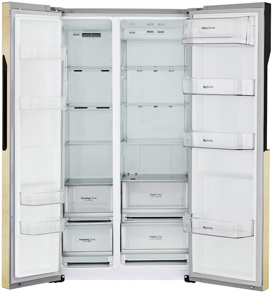 Данная модель — отдельностоящая, поэтому нужно тщательно подобрать место для ее размещения. Холодильник Side-by-Side с необычным расположением камер — сбоку друг от друга — позволяет увеличить объем продуктов для хранения. Такой вариант подходит обладателям просторной кухни, большим семьям, людям, которые запасают продукты и готовят впрок. Количество камер: 2.