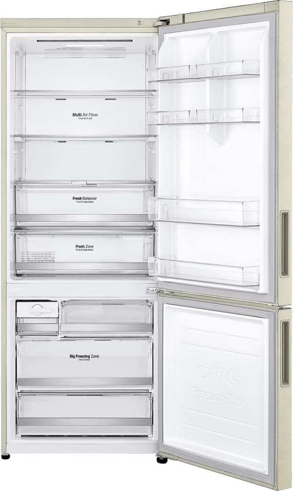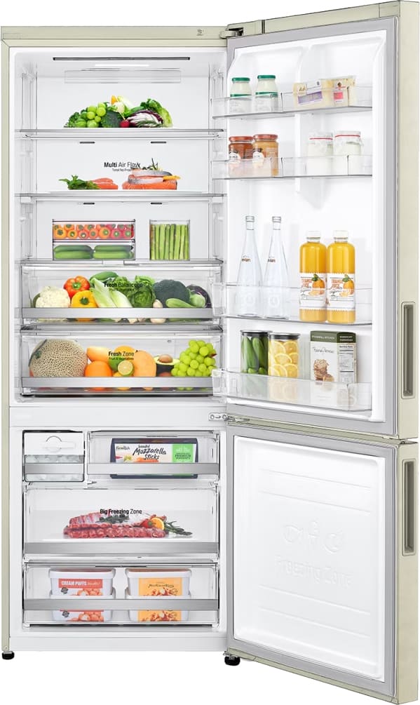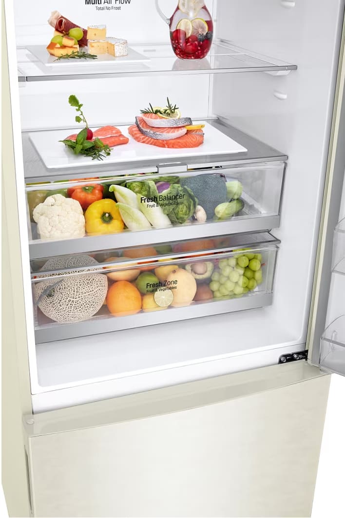 Специальная зона свежести предназначена для правильного и более длительного хранения овощей, фруктов, зелени. В ней поддерживается околонулевая температура, поэтому продукты не перемораживаются и не пересыхают. Система охлаждения этого холодильника — Multi-Airflow-System.