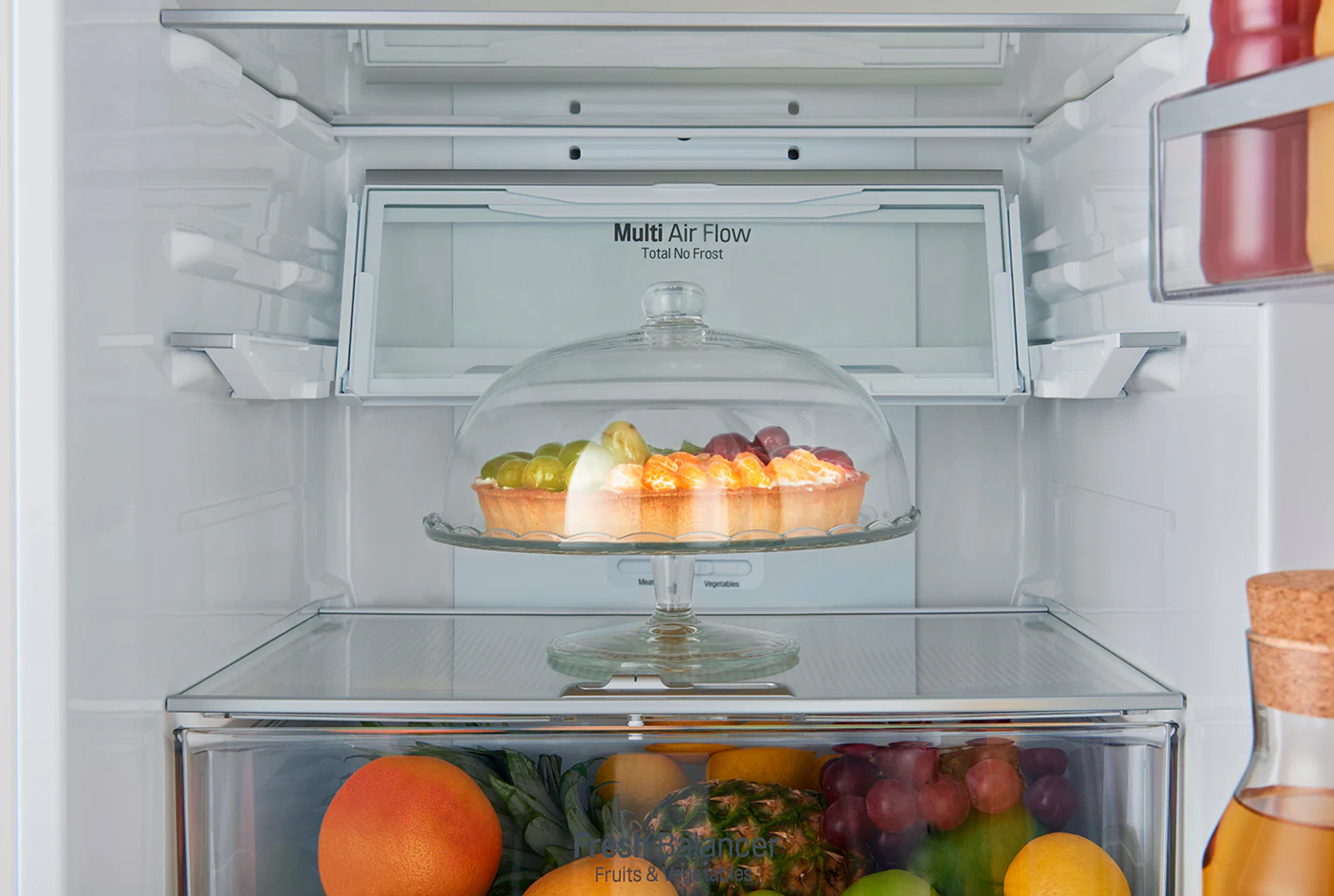 Специальная зона свежести предназначена для правильного и более длительного хранения овощей, фруктов, зелени. В ней поддерживается околонулевая температура, поэтому продукты не перемораживаются и не пересыхают. Система охлаждения этого холодильника — Multi-Airflow-System.