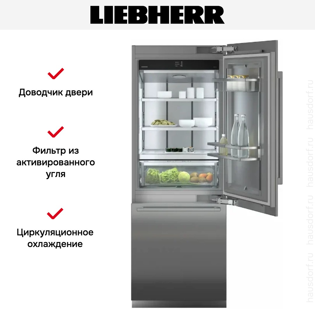 Встраиваемый холодильник с морозильником Liebherr ECBN 9471 Peak демонстрирует сдержанную элегантность и продуманную функциональность, созданную для интеграции в современную кухню под ваш фасад. Корпус из стали и сухая задняя стенка из нержавеющей стали обеспечивают долгий срок службы и простоту ухода, а система жесткого крепления door on door гарантирует плотную и аккуратную установку без видимых зазоров. Максимально допустимый вес облицовки до 22 и 13 кг позволяет установить плотные фасады, сохраняя ровную линию мебельного ряда.