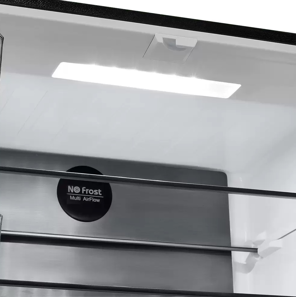 No Frost (Total No Frost, Frost Free): вентилятор обеспечивает циркуляцию охлажденного воздуха, благодаря чему лед не нарастает на стенке, а концентрируется только на скрытом внутри холодильника испарителе. Талая вода собирается в специальной емкости и испаряется. Такой холодильник не нужно размораживать – это экономит время и позволяет не останавливать прибор. Благодаря этим плюсам в современных моделях No Frost – самая распространенная система.