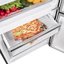 В холодильной камере внутреннее наполнение составляют 4 полки из закаленного стекла с металлическим усилением, зона свежести, подвесная полка для бутылок и большой ящик для фруктов и овощей. В морозильной камере продукты размещаются в 3 выдвижных ящиках.