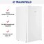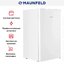 Maunfeld MFF83W — небольшой отдельно стоящий холодильник высотой 83 см с одной дверцей и маленькой морозильной камерой в верхней части. Общий полезный объем составляет 92 литра, объем морозильной камеры — 7 литров. Дверной упор находится справа, при необходимости его можно перенести на левую сторону. Благодаря своим габаритам холодильник может быть размещен под столешницей. Такая модель подойдет для студии, офиса, гостиницы, а вес всего 21 кг позволит легко перевезти его летом на дачу. Климатический класс ST означает, что нормальная работа холодильника гарантируется при температурах окружающей среды от + 18 до + 38 градусов. Устройство отличается экономичностью и относится к классу энергопотребления A+, а уровень шума у него составляет всего 40 дБ. Корпус изготовлен из металла с прочным белым эмалевым покрытием. Это недорогое устройство размораживается вручную. Пластиковые стенки камеры изнутри защищены антибактериальным покрытием от появления неприятных запахов и болезнетворных микроорганизмов.