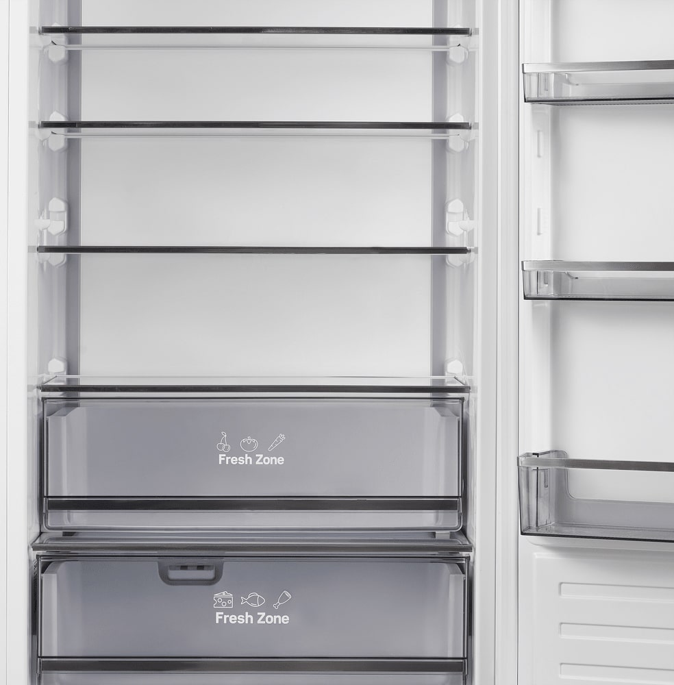 Специальная зона свежести предназначена для правильного и более длительного хранения овощей, фруктов, зелени. В ней поддерживается околонулевая температура, поэтому продукты не перемораживаются и не пересыхают. Система охлаждения этого холодильника — циркуляционная .