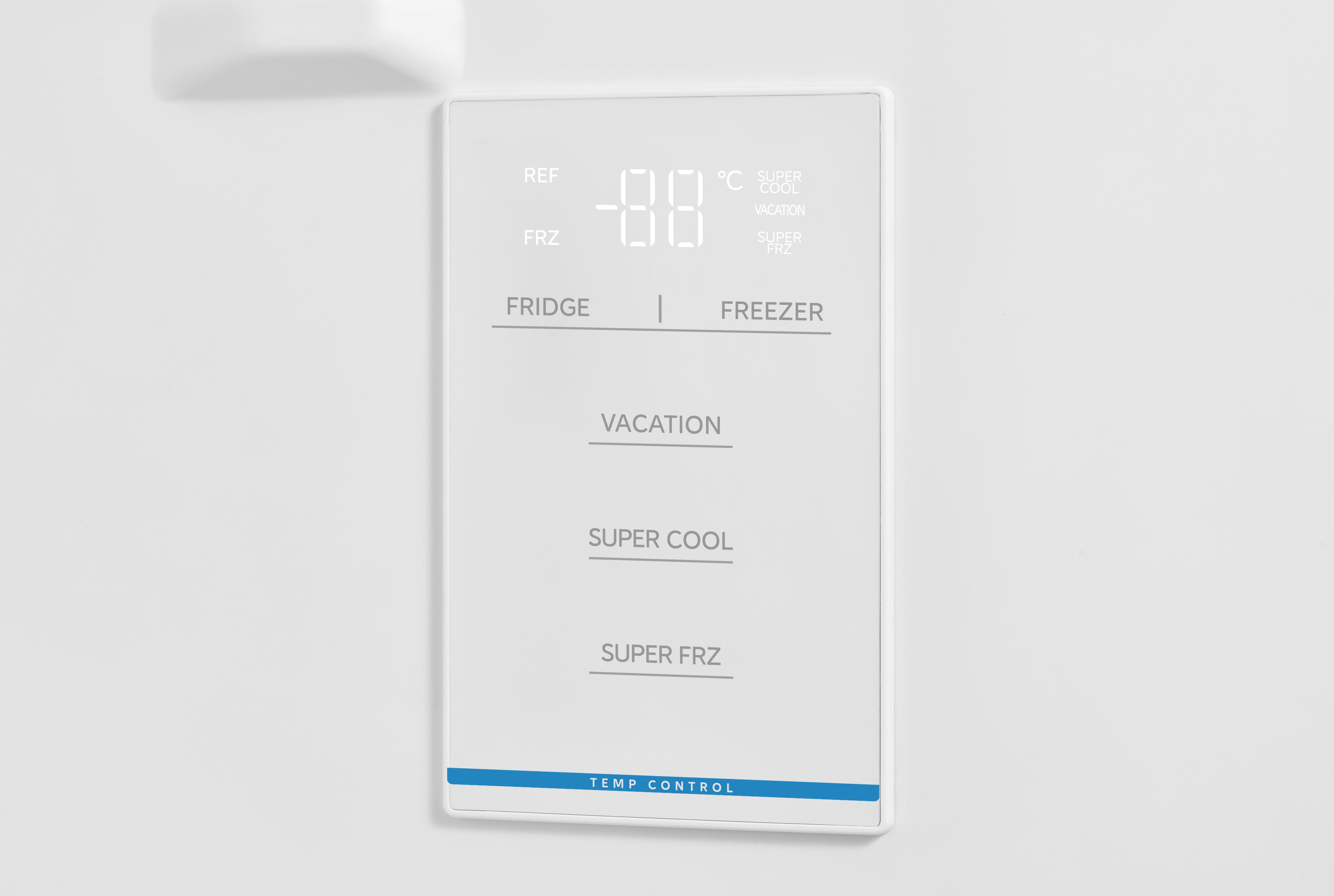 Гораздо точнее сориентироваться по индикаторам можно в холодильниках с электронной системой управления. Эти устройства обычно оснащены дисплеем, на котором высвечиваются значения фактической температуры в холодильной и морозильной камерах. Рядом с ними располагаются кнопки, во многих случаях сенсорные, при помощи которых можно регулировать температуру в каждой камере отдельно, и индикаторы включения этих камер. Здесь же, на панели инструментов, находятся индикаторы, указывающие на активацию дополнительных опций — например, режимов быстрого замораживания и быстрого охлаждения, отпускного режима, блокировки панели управления от детей.
