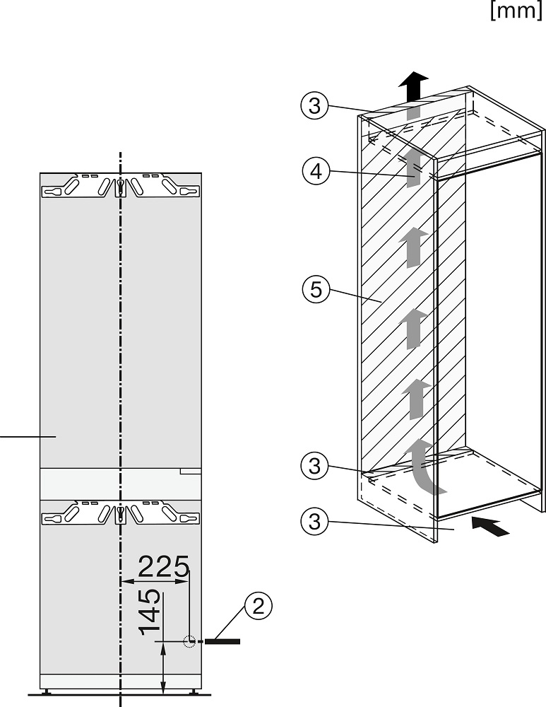 Встраиваемые холодильники монтируются в нишу или колонну. Передняя их часть закрывается декоративным мебельным фасадом и снаружи не отличается от дверцы обычного кухонного шкафа, так что их не нужно подбирать под интерьер помещения. Объем этих холодильников, как правило, несколько меньше, чем у отдельностоящих, так как при встраивании необходимо оставлять свободное пространство для вентиляции. Они отличаются меньшим уровнем шума, а также лучше держат холод и отличаются большей экономичностью из-за дополнительного слоя изоляции. Ассортимент этих холодильников не так велик, как у отдельно стоящих, установка более трудоемкая, а стоимость обычно несколько выше.