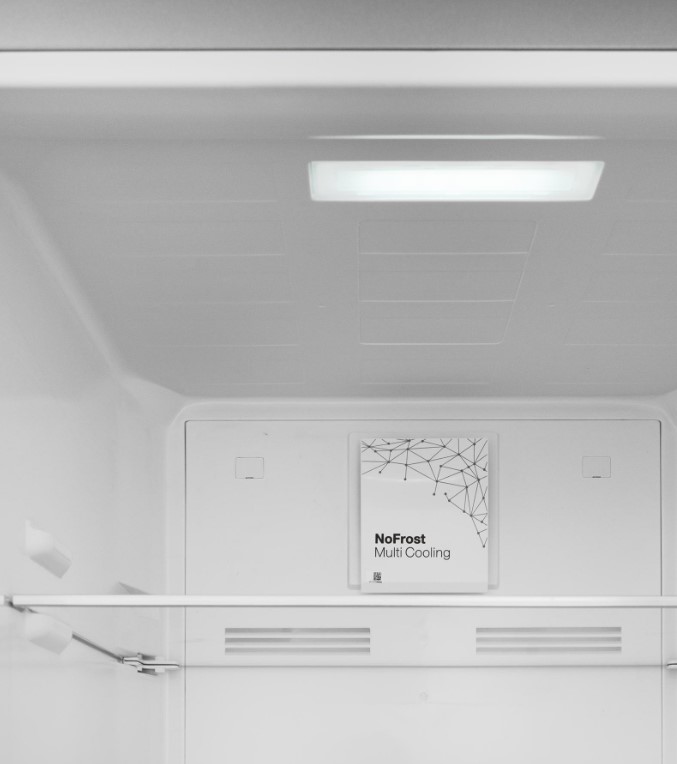 No Frost (Total No Frost, Frost Free): вентилятор обеспечивает циркуляцию охлажденного воздуха, благодаря чему лед не нарастает на стенке, а концентрируется только на скрытом внутри холодильника испарителе. Талая вода собирается в специальной емкости и испаряется. Такой холодильник не нужно размораживать – это экономит время и позволяет не останавливать прибор. Благодаря этим плюсам в современных моделях No Frost – самая распространенная система.