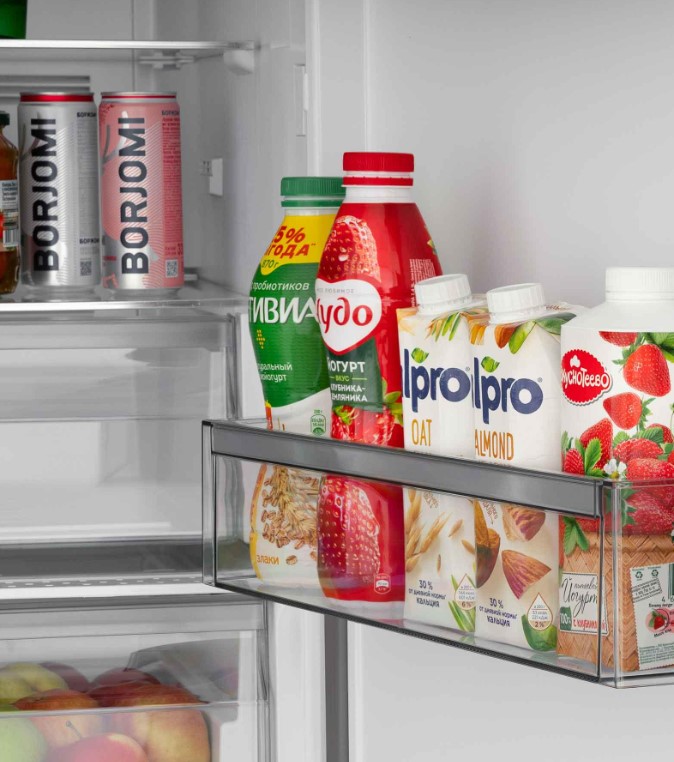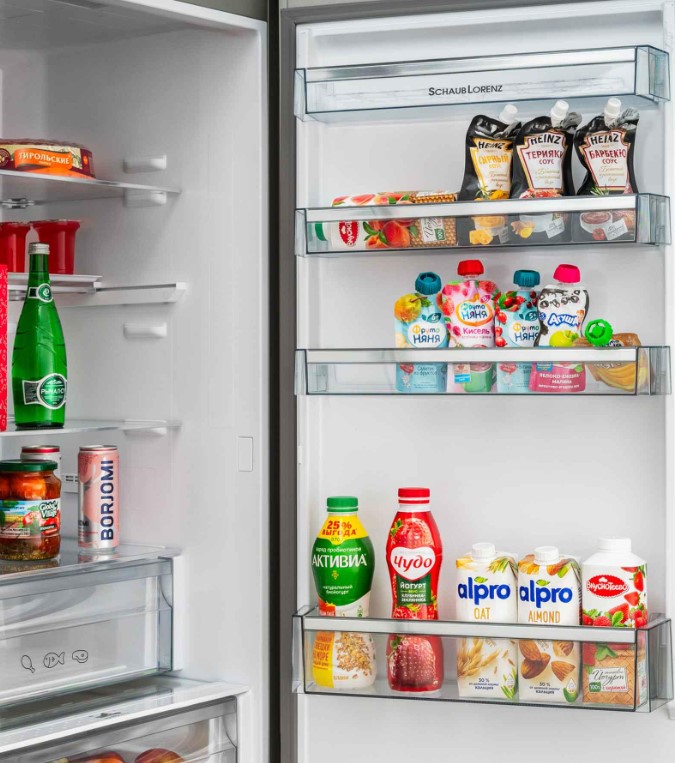 Ящики для продуктов изготавливаются либо целиком из прозрачного пластика, либо часто имеют переднюю прозрачную панель, которая обеспечивает лучший обзор. Полки в большинстве холодильников могут перемещаться по высоте, устанавливаются на специальных направляющих и без труда снимаются для очистки.