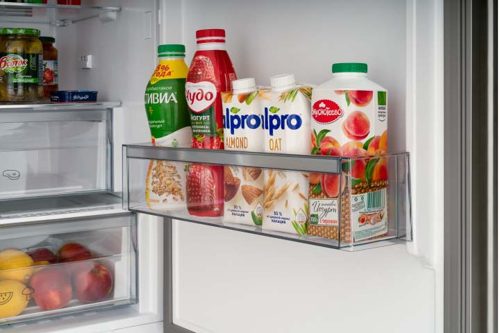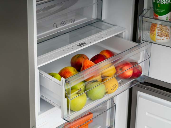 Ящики для продуктов изготавливаются либо целиком из прозрачного пластика, либо часто имеют переднюю прозрачную панель, которая обеспечивает лучший обзор. Полки в большинстве холодильников могут перемещаться по высоте, устанавливаются на специальных направляющих и без труда снимаются для очистки.