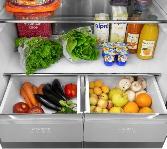Вместительные контейнеры позволяют хранить достаточное количество овощей и фруктов. Для более длительного хранения и поддержания свежести овощей и фруктов разработаны специальные системы хранения. Среди них, например, зона свежести с увеличенной влажностью до 85% и температурой около 0 градусов. Это герметично закрывающийся ящик, часто на выдвижных роликах или направляющих, в котором имеется специальное задвижка, позволяющая регулировать влажность. Как известно, при более высокой влажности продукты с большим содержанием воды дольше остаются свежими.