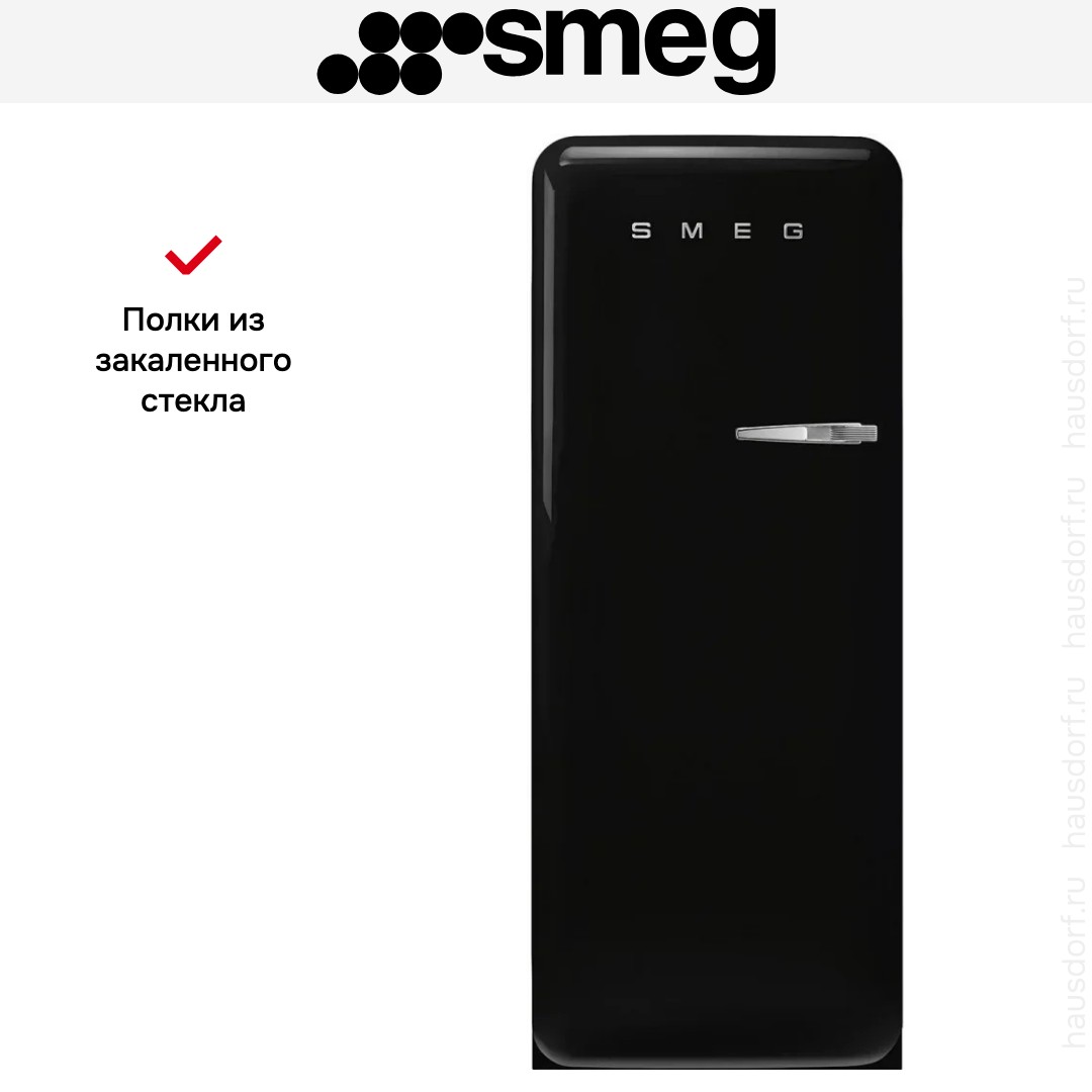 Холодильник Smeg FAB28LBL6. Как продавец-консультант отмечу, что это отдельностоящая модель с верхней морозильной камерой, выполненная в узнаваемом стиле 50-х годов и эффектном черном цвете. Внешняя ручка и левая сторона дверного упора подчеркивают винтажную эстетику, а при этом сохраняют удобство повседневного использования. Габариты 153×60.1×72.8 см делают прибор компактным вариантом для кухни средней площади, но при этом внутренняя вместимость вполне достаточна для семьи из двух-трех человек.