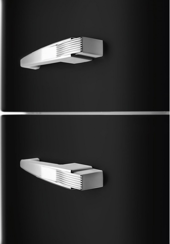 Внешняя ручка может не только послужить для открывания дверцы, но и стать интересной деталью интерьера. Особенно это касается ручек в ретро-стиле со встроенным толкателем и замком. Однако подобные элементы являются достаточно небезопасными, так как холодильник невозможно открыть изнутри. Обычные накладные дверные ручки устанавливаются на холодильник в вертикальном или горизонтальном положении. При этом особенной популярностью пользуются вертикальные ручки, идущие по всей длине камеры. Такая конструкция подойдет для людей любого роста.