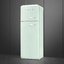 Двухкамерный холодильник пастельного зеленого цвета в стиле 50-х годов станет изюминкой вашего интерьера. Морозильник расположен сверху, имеет два отсека, разделенных полкой. В холодильной камере полки из закаленного стекла (в том числе на двери), есть специальное отделение для бутылок.