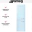 Smeg FAB32LPB5 — модель высотой 197 см и объемом 365 литров относится к ретро-серии в стиле 50-х годов. Дверной упор расположен слева, петли не перенавешиваются. Температура в камере регулируется с помощью термостата. Двухкамерный холодильник пастельного голубого цвета отвечает всем стандартным запросам: