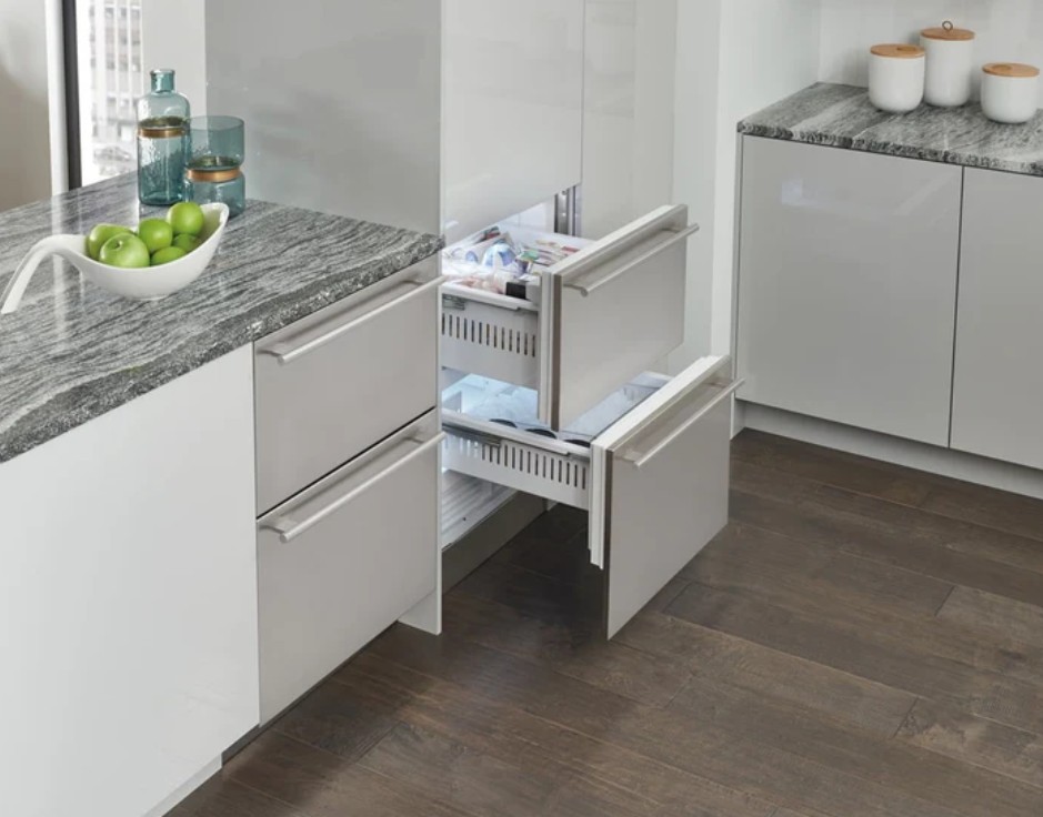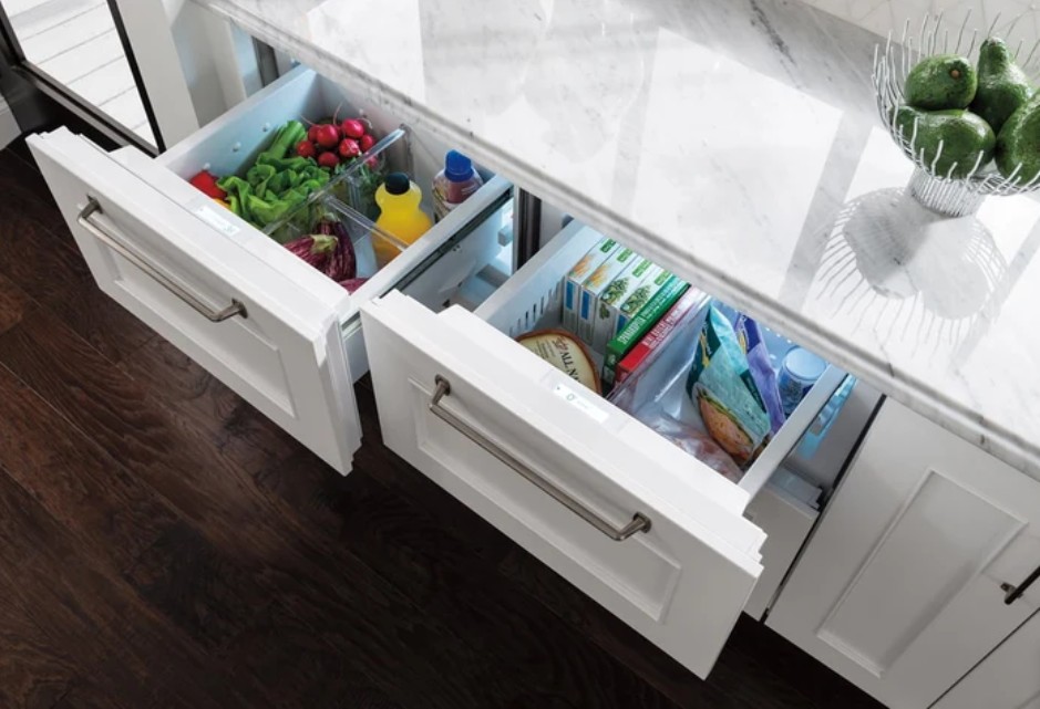 Трехкамерные модели выпускаются в нескольких вариантах. В некоторых случаях в качестве третьей камеры поступает так называемая зона свежести — отделение, где поддерживается температура около 0 градусов. В другом варианте подобные модели имеют морозильную камеру, состоящую из двух выдвижных ящиков.