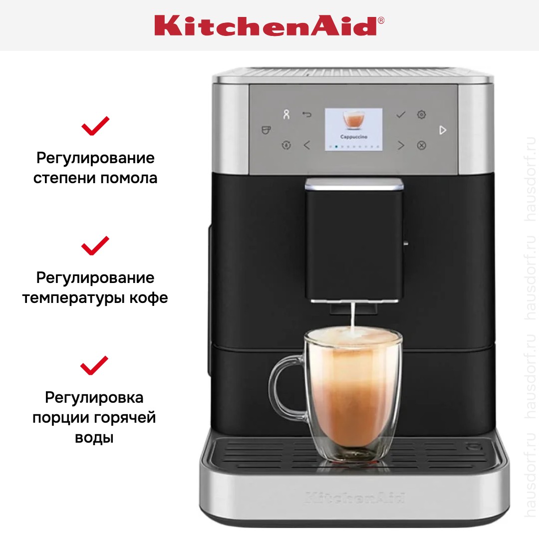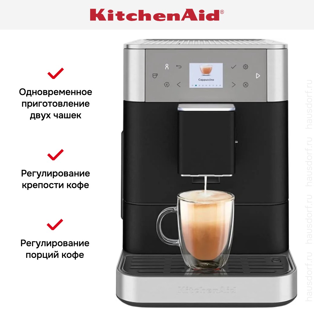 В модели KitchenAid 5KES8556EBK используются сразу два типа кофе — молотый и зерновой: это расширяет ваши возможности и увеличивает разнообразие напитков, которые можно приготовить с отличиями в крепости, ароматности и терпкости. Автоматическая кофемашина — по сути облегченная и уменьшенная версия приборов из кафе, она обладает широкими возможностями, разнообразным меню и продуманной системой контроля за процессом. Это отличный выбор как для дома, так и для офиса.