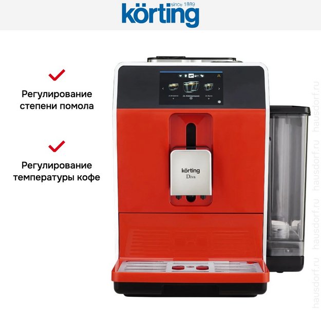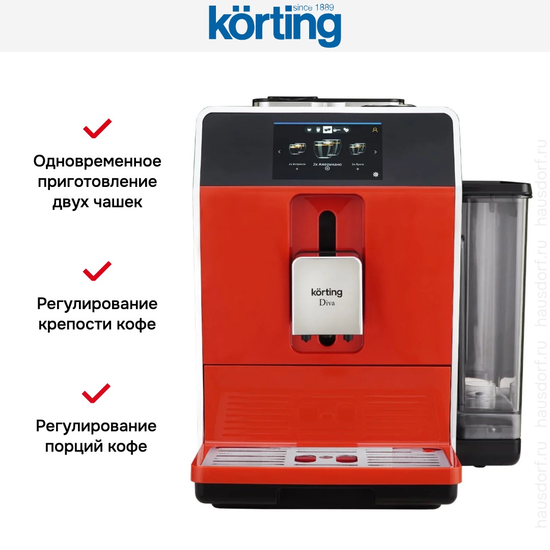 В модели Korting KACM 2005 Diva используются сразу два типа кофе — молотый и зерновой: это расширяет ваши возможности и увеличивает разнообразие напитков, которые можно приготовить с отличиями в крепости, ароматности и терпкости. Автоматическая кофемашина — по сути облегченная и уменьшенная версия приборов из кафе, она обладает широкими возможностями, разнообразным меню и продуманной системой контроля за процессом. Это отличный выбор как для дома, так и для офиса.
