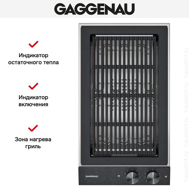 Общая ширина прибора — 29 см, высота — 12, 5 см, глубина — 51 см. Стандартные размеры и специальные соединительные планки черного или стального цвета позволяют встраивать гриль Гаггенау рядом с варочными поверхностями из серии Vario. Предусмотрено удобное крепление к столешнице накладным способом. Фронтальная механическая панель управления черного цвета оснащена двумя поворотными переключателями: они служат для выбора мощности нагрева передней и задней зон. Всего предусмотрено 9 уровней мощности. О том, что прибор включен, сигнализирует световое кольцо оранжевого цвета на каждом переключателе.