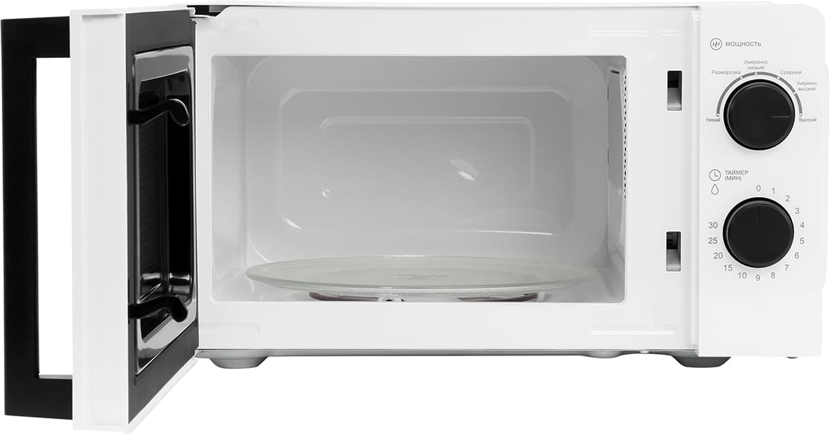 Материал внутренней поверхности — эмаль. Это самое распространенное покрытие, так как оно зарекомендовало себя высоким качеством, устойчивостью к механическим воздействиям и простотой ухода. Полезный объем для готовки — 20 л. Для установки и прогрева посуды используется классическое вращающееся блюдо. Стандартное механическое управление не вызовет трудностей ни у кого из вашей семьи. Для изменения настроек или выбора программ используются следующие переключатели: поворотные.