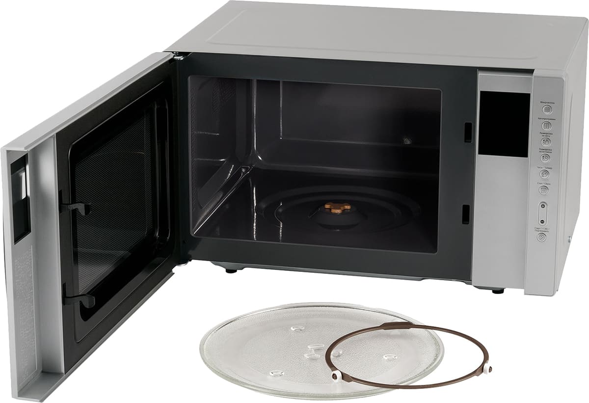 Конвекционный вентилятор устанавливается в микроволновках без поворотного стола: равномерное распределение горячего воздуха позволяет размещать в камере сразу несколько блюд. Комбинация вентилятора и верхнего гриля называется турбогрилем: этот режим очень хорош для выпечки больших пирогов и кексов. Сочетание гриля и конвекции подойдет и для приготовления больших кусков мяса или целой птицы и рыбы. Добавление традиционного нижнего нагревательного элемента превращает микроволновую печь в аналог полноценной духовки: с ее помощью можно готовить, разогревать и размораживать, запекать и томить, обжаривать и тушить.