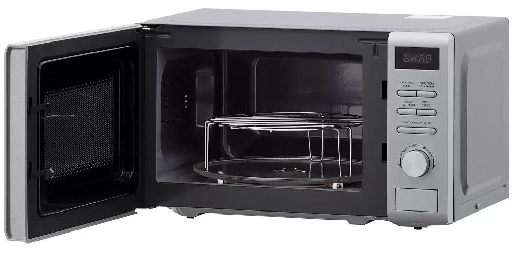 Гриль в микроволновой печи расширяет возможности прибора и позволяет использовать его для приготовления множества полноценных блюд. Он представляет собой дополнительный нагревательный элемент, установленный в верхней части камеры, и может использоваться как отдельно, так и в комбинации с микроволнами. Комбинированные режимы помогут не только быстрее разогревать или размораживать, но и получать блюда с запеченной румяной корочкой. Такие печи несколько дороже микроволновок соло, а использование гриля требует более тщательной очистки стенок камеры от капель жира и жидкости.
