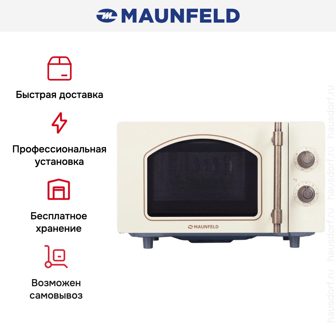Микроволновая печь Maunfeld JFSMO 20.5 ERIB сочетает ретро-стиль и современные технологии, создавая акцент в любой кухне. Корпус в цвете слоновой кости с бронзовой фурнитурой выглядит тепло и благородно. Компактные габариты 28.5×45.5×36.5 см и объем 20 литров делают устройство идеальным для небольшой семьи или офиса. Отдельностоящий формат легко размещается на столешнице или в нише, не требуя сложного монтажа.