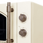 Цвет и стиль фурнитуры микроволновых печей определяется общим дизайном изделия. Большинство отдельно стоящих моделей изготавливается в современном минималистическом стиле, предусматривающем лаконичную отделку, соответствующую тону корпуса или реже контрастирующую с ним. Для этих изделий характерны ручки и поворотные переключатели белого и черного цветов, и также детали стального и серебристого оттенка. Реже производители предлагают отдельно стоящие модели в ретро, деревенском и классическом стиле с фурнитурой цвета бронзы, латуни — как, например, в печах от MAUNFELD и Gorenje.