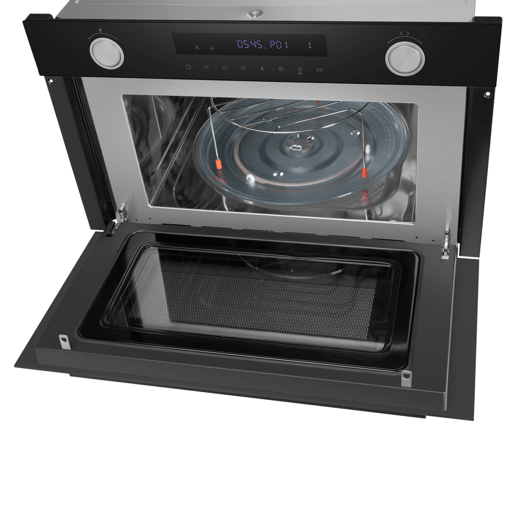 Конвекционный вентилятор устанавливается в микроволновках без поворотного стола: равномерное распределение горячего воздуха позволяет размещать в камере сразу несколько блюд. Комбинация вентилятора и верхнего гриля называется турбогрилем: этот режим очень хорош для выпечки больших пирогов и кексов. Сочетание гриля и конвекции подойдет и для приготовления больших кусков мяса или целой птицы и рыбы. Добавление традиционного нижнего нагревательного элемента превращает микроволновую печь в аналог полноценной духовки: с ее помощью можно готовить, разогревать и размораживать, запекать и томить, обжаривать и тушить.