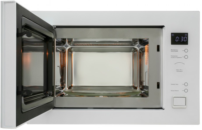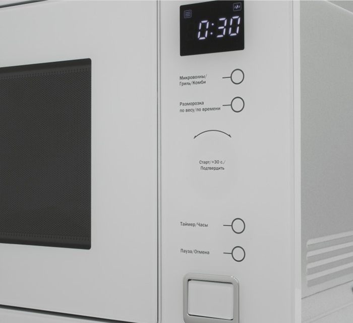 Высота микроволновой печи, то есть расстояние от основания до крышки прибора, определяется прежде всего типом встраивания. Отдельно стоящие модели — как соло, так и оснащенные грилем или конвекцией, — с камерой объемом от 15 до 30 литров, имеют высоту около 30 см. Такие микроволновки удобно размещаются на столе; при необходимости их можно убрать на полку или в шкаф. Встраиваемые в стандартную кухонную колонну или тумбу многофункциональные микроволновые печи имеют ту же высоту, что и другая встроенная техника: для компактных приборов она составляет 45 см, а для полноразмерных — порядка 60 см.