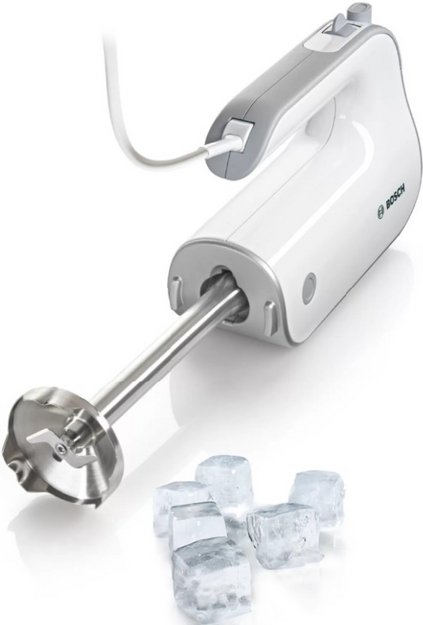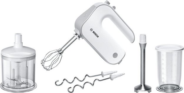 Обратите внимание на цвет миксера Бош — белый — он может стать как гармоничным дополнением кухонной обстановки, так и ярким акцентом. В комплекте с самим прибором идут дополнительные элементы: венчик для взбивания, измельчитель, крюки для теста, мерный стакан с крышкой, насадка-блендер.
