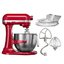 Обратите внимание на цвет миксера Китчен Эйд — карамельное яблоко — он может стать как гармоничным дополнением кухонной обстановки, так и ярким акцентом. В комплекте с самим прибором идут дополнительные элементы: венчик для взбивания, защитный обод с воронкой для засыпания продуктов, крюки для теста, насадка-лопатка для перемешивания. Вы можете приобрести и установить другие насадки, для них создано специальное гнездо. Также производитель предусмотрел вариант расширения функционала до кухонного комбайна.