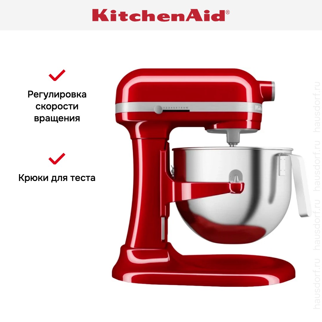 Обратите внимание на цвет миксера Китчен Эйд — красный — он может стать как гармоничным дополнением кухонной обстановки, так и ярким акцентом. В комплекте с самим прибором идут дополнительные элементы: венчик для взбивания, крюки для теста, лопатка с гибким ребром.