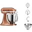 Обратите внимание на цвет миксера Китчен Эйд — медь — он может стать как гармоничным дополнением кухонной обстановки, так и ярким акцентом. В комплекте с самим прибором идут дополнительные элементы: венчик для взбивания, крюки для теста, насадка-лопатка для перемешивания, чаша из нержавеющей стали объемом 3 л, прозрачный защитный обод.