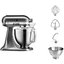 Обратите внимание на цвет миксера Китчен Эйд — матовый никель — он может стать как гармоничным дополнением кухонной обстановки, так и ярким акцентом. В комплекте с самим прибором идут дополнительные элементы: венчик для взбивания, крюки для теста, насадка-лопатка для перемешивания, чаша из нержавеющей стали объемом 3 л, прозрачный защитный обод.