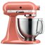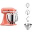 Обратите внимание на цвет миксера Китчен Эйд — коралловый — он может стать как гармоничным дополнением кухонной обстановки, так и ярким акцентом. В комплекте с самим прибором идут дополнительные элементы: венчик для взбивания, крюки для теста, насадка-лопатка для перемешивания, чаша из нержавеющей стали объемом 3 л, прозрачный защитный обод.