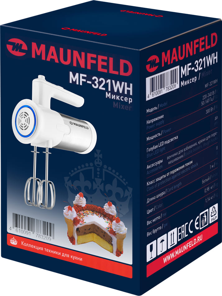 Обратите внимание на цвет миксера Маунфилд — белый — он может стать как гармоничным дополнением кухонной обстановки, так и ярким акцентом. В комплекте с самим прибором идут дополнительные элементы: венчик для взбивания, крюки для теста.
