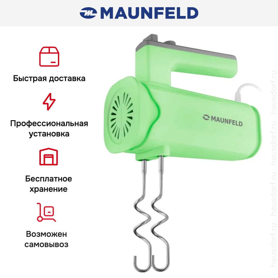 Обратите внимание на цвет миксера Маунфилд — зеленый — он может стать как гармоничным дополнением кухонной обстановки, так и ярким акцентом. В комплекте с самим прибором идут дополнительные элементы: венчик для взбивания, крюки для теста.