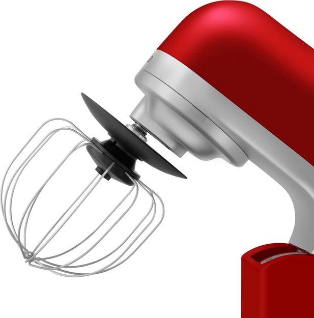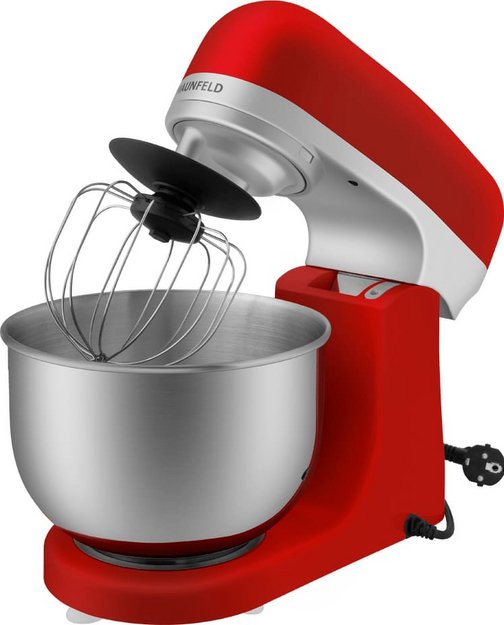 Обратите внимание на цвет миксера Маунфилд — вишня — он может стать как гармоничным дополнением кухонной обстановки, так и ярким акцентом. В комплекте с самим прибором идут дополнительные элементы: венчик для взбивания, защитный обод с воронкой для засыпания продуктов, крюки для теста, насадка-лопатка для перемешивания.
