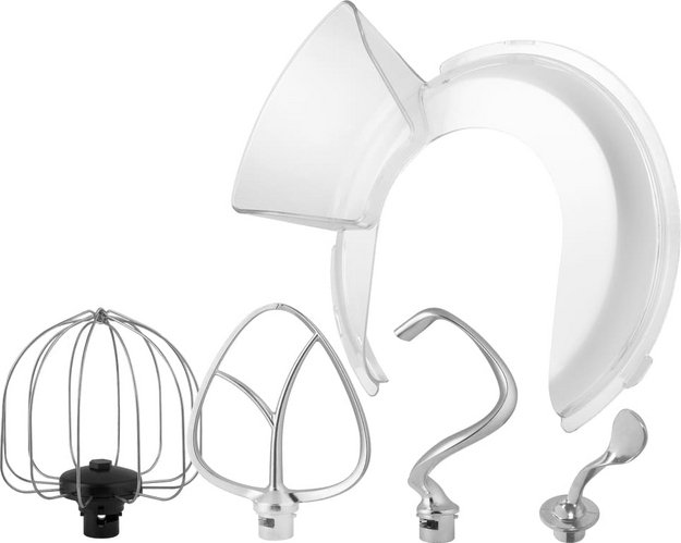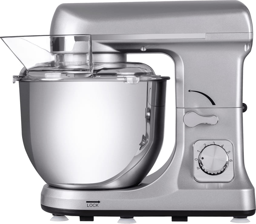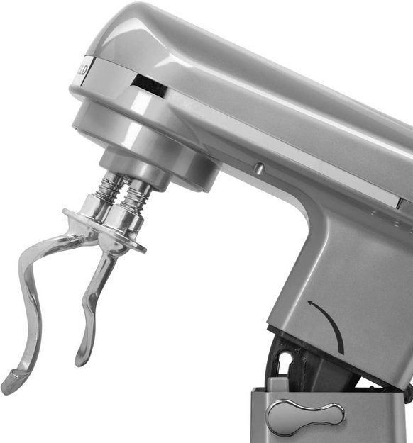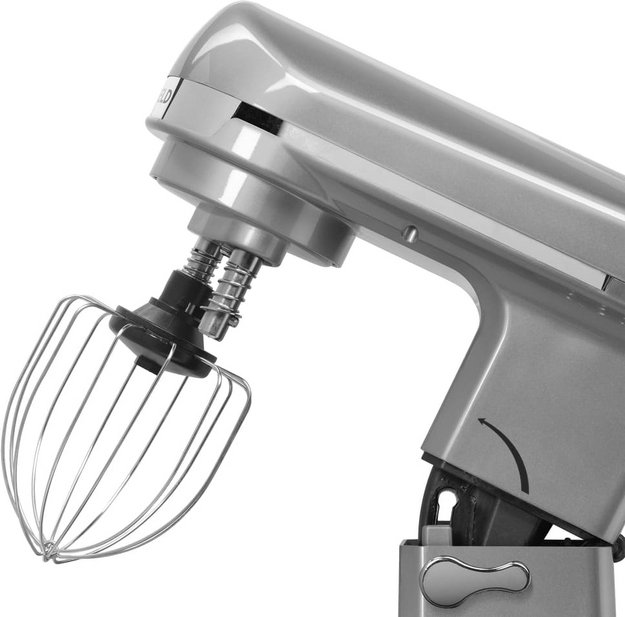Обратите внимание на цвет миксера Маунфилд — нержавеющая сталь — он может стать как гармоничным дополнением кухонной обстановки, так и ярким акцентом. В комплекте с самим прибором идут дополнительные элементы: венчик для взбивания, защитный обод с воронкой для засыпания продуктов, крюки для теста, насадка-лопатка для перемешивания. Вы можете приобрести и установить другие насадки, для них создано специальное гнездо.